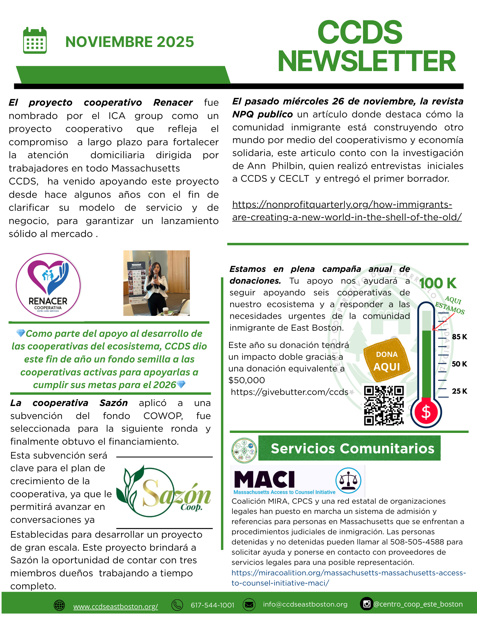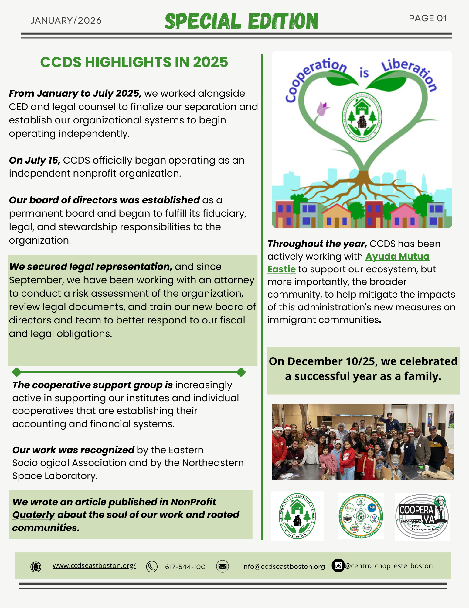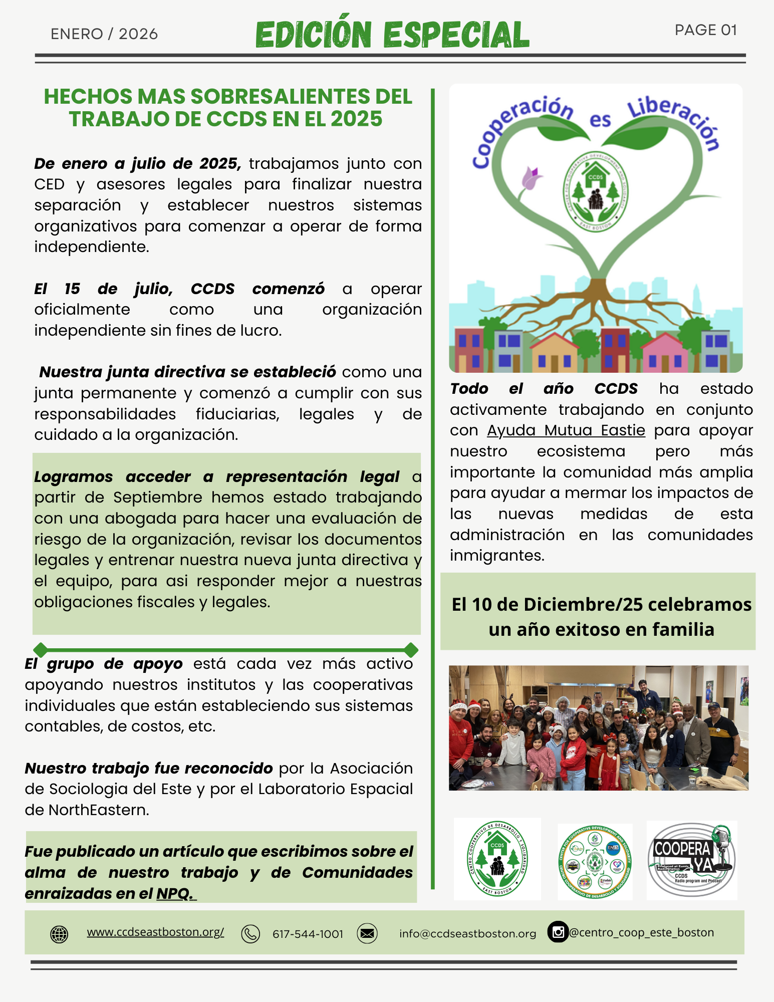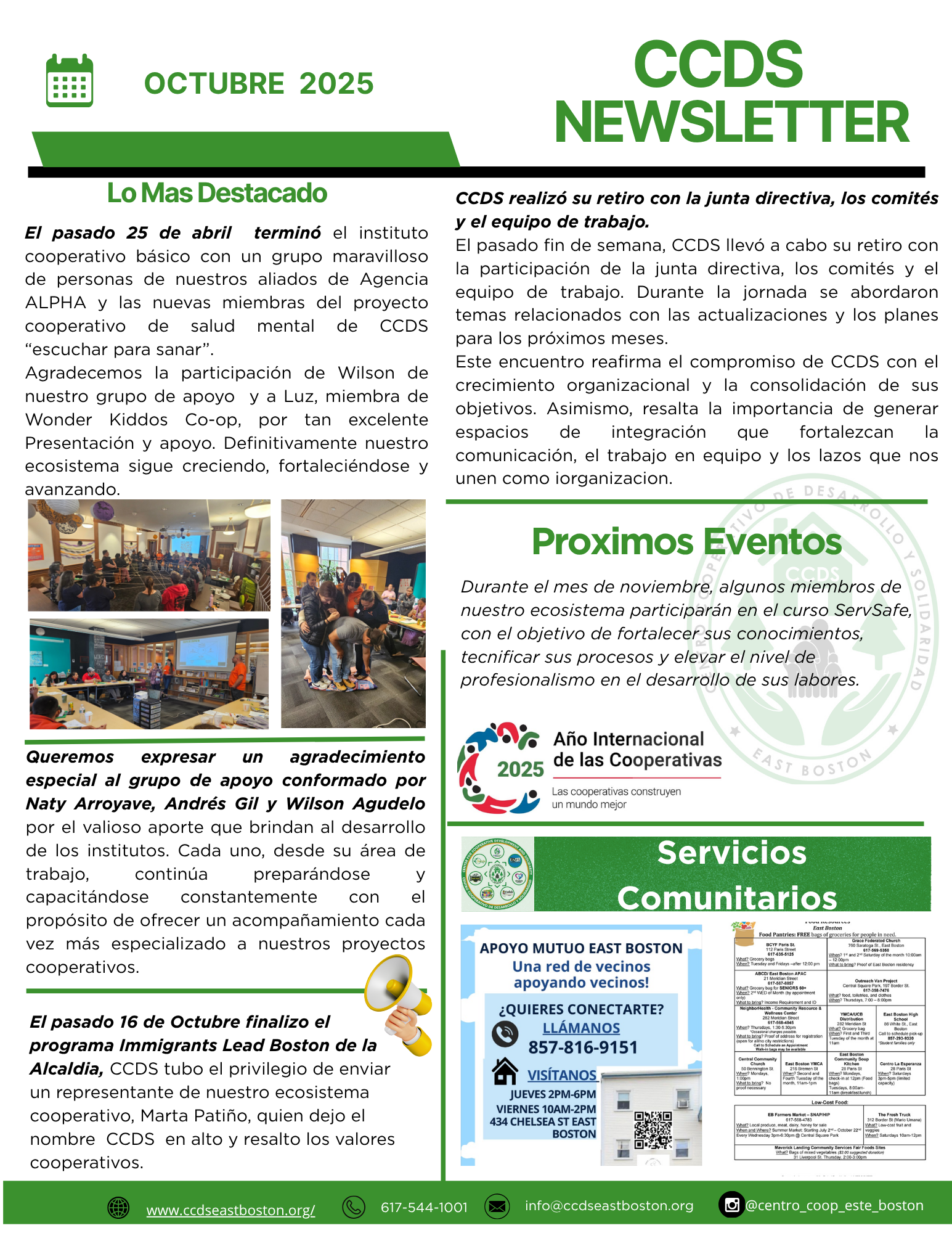 The Center for Cooperative Development and Solidarity (CCDS) is a community-based organization that promotes cooperativism and solidarity economies while supporting the development of worker-owned cooperatives, primarily in the immigrant community of East Boston. The majority of CCDS staff and leadership are Latina immigrants living in East Boston and surrounding communities that have been affected by economic inequality and rapid gentrification.