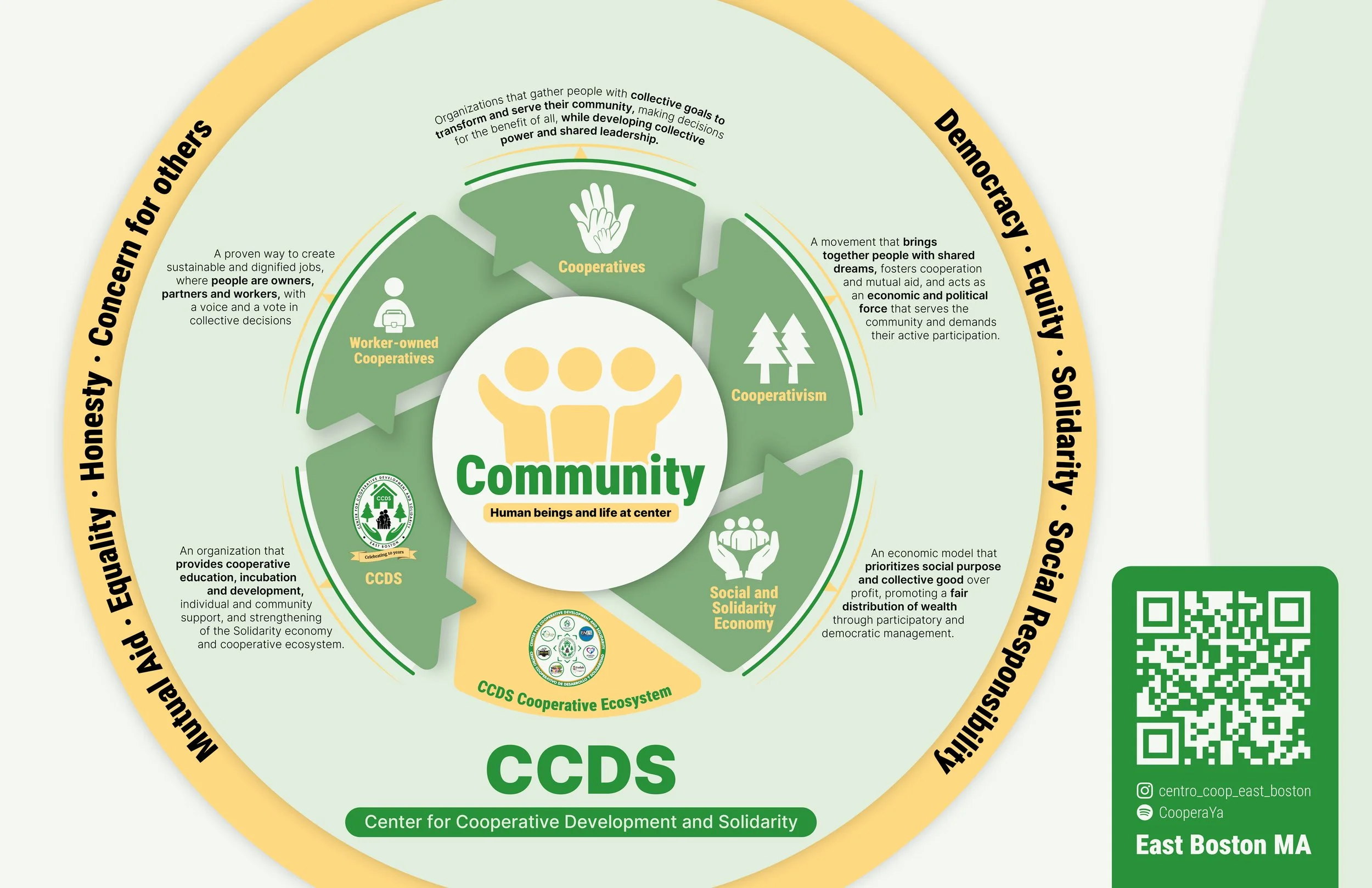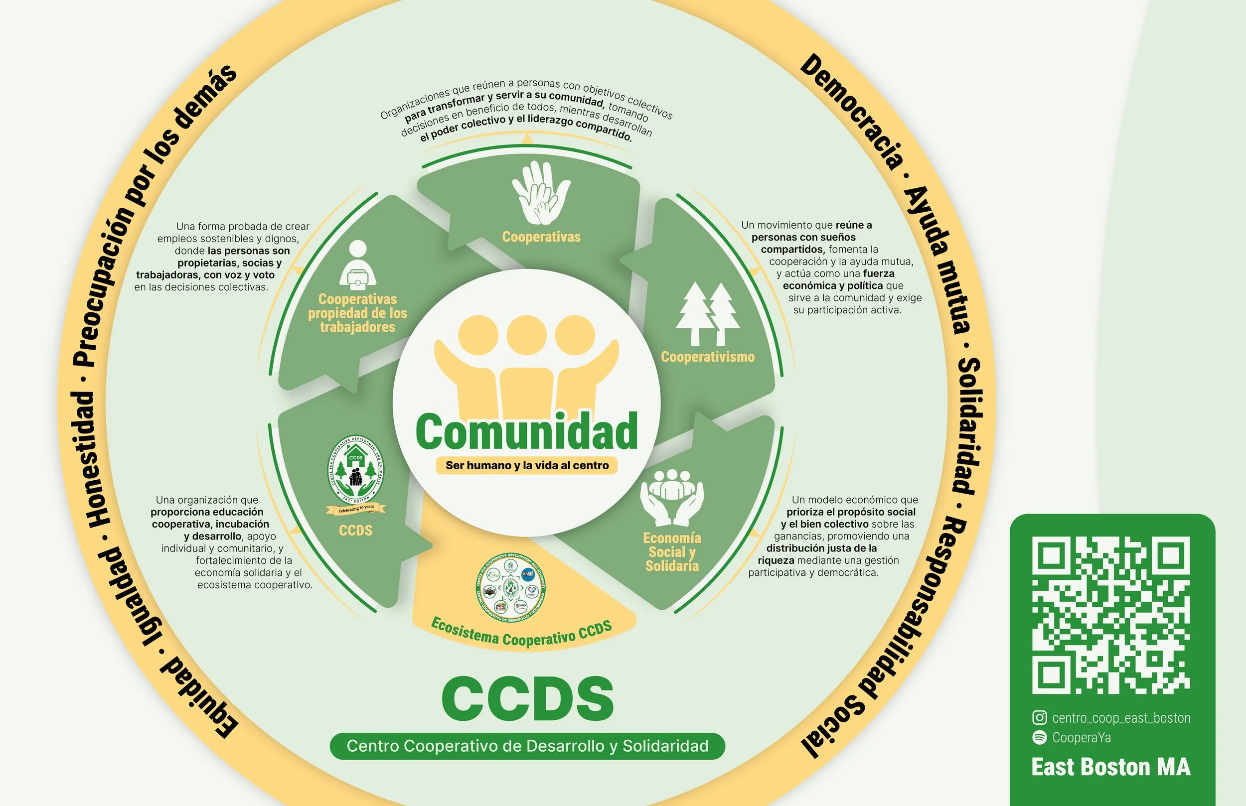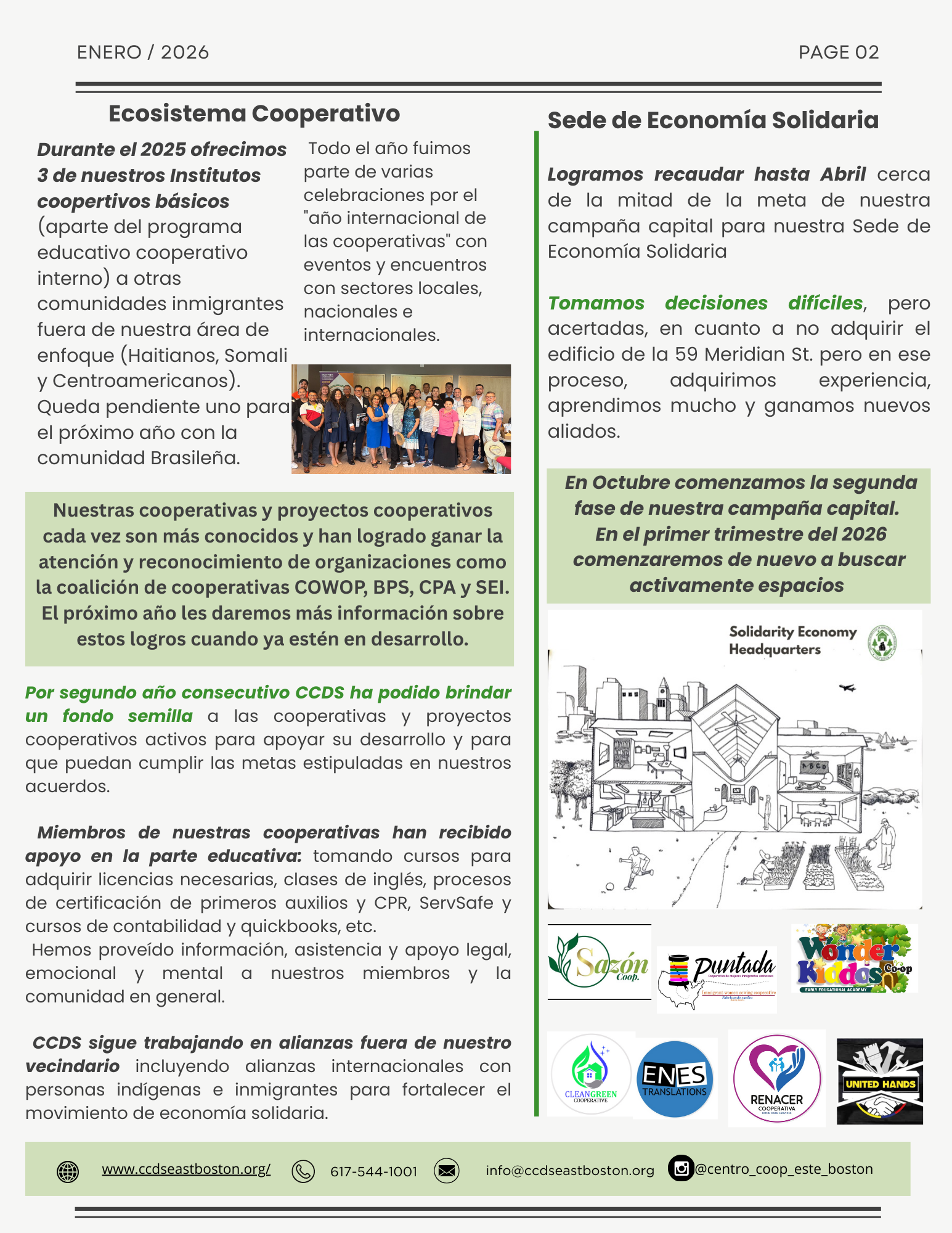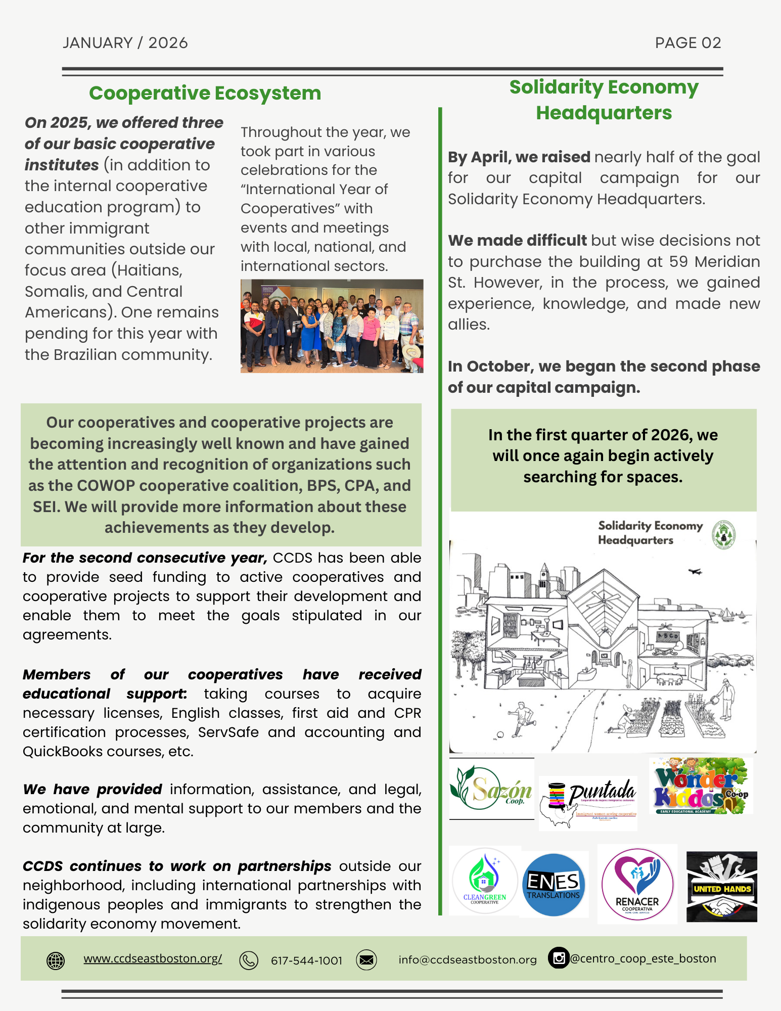 The Center for Cooperative Development and Solidarity (CCDS) is a community-based organization that promotes cooperativism and solidarity economies while supporting the development of worker-owned cooperatives, primarily in the immigrant community of East Boston. The majority of CCDS staff and leadership are Latina immigrants living in East Boston and surrounding communities that have been affected by economic inequality and rapid gentrification.